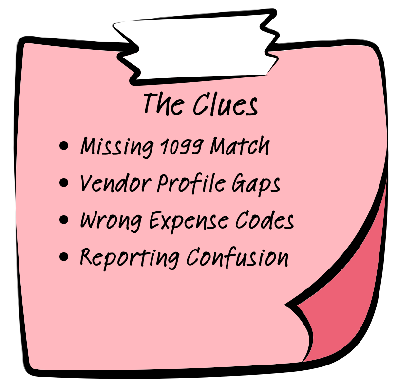 The client was sure they’d paid their contractors. The bank statements agreed. But when 1099s were generated? Crickets. Detective Debit raised an eyebrow. “Let’s check the setup.”